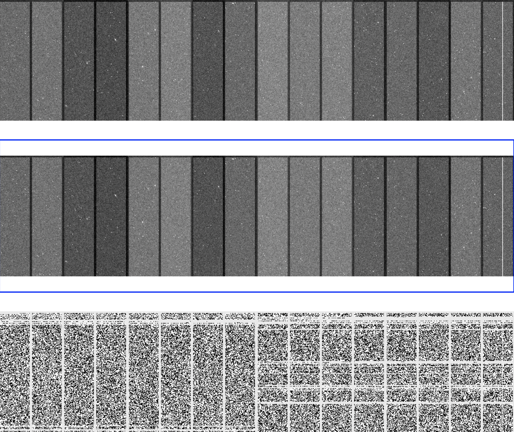 - 如下图,自上而下分别是:关闭非线性、打开非线性、residual。可以看出,residual图像中有些地方出现横条纹。我看了读数是0.说明这些列在前后两次仿真的图像里面完全一致。理论上这会不会影响数据处理,我不确定,需要讨论,但起码说明随机数不是很随机。