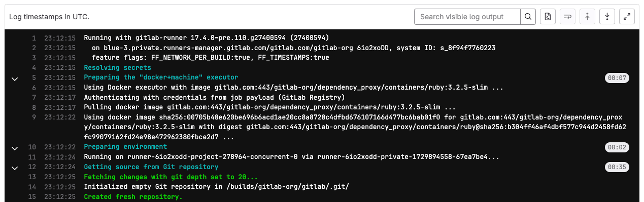 To enable timestamps in job logs, add a FF_TIMESTAMPS CI/CD variable